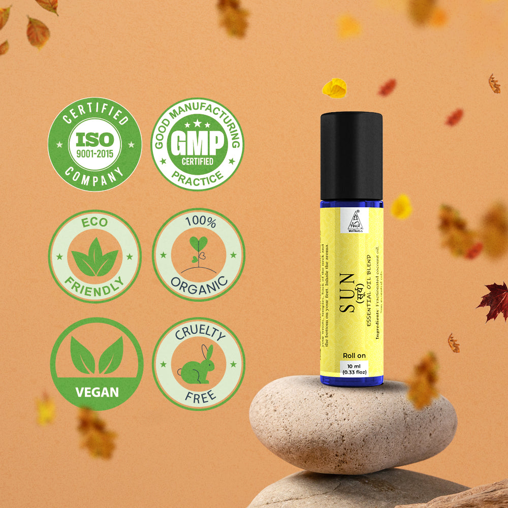 The Sun Essential Oil Roll-On is an energizing planetary blend aligned with the radiant and powerful energy of the Sun (Surya)—the source of vitality, authority, confidence, and self-expression. This roll-on is designed to strengthen inner power, boost self-esteem, and activate leadership qualities while supporting physical and emotional vitality.